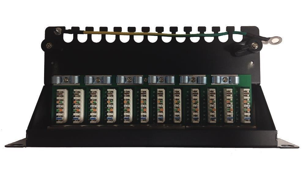 Patch panel osazený 12 porty s Cat.6, vhodný pro narážeč typu LSA. Vnitřní kryt patch panelu dovoluje manipulaci v malé skříni bez rizika vytáhnutí kabelu ze zářezového konektoru. Vyvazovací koncovky dovolují pevně přitáhnout kabelový vývod k panelu. Součástí zařízení je zemnící přívod a napojení stínění přímo na PCB.