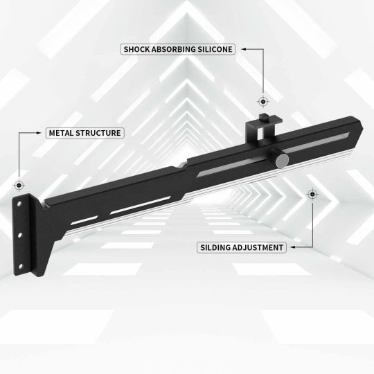 Stylová varianta této opory Vaší grafické karty je vyrobena z ocelového práškově lakovaného plechu a plastu, zabraňuje prohýbání větších karet ve slotu a dodává tak sestavě lepší celkovou stabilitu. Součástí je silikonová posuvná opora, kterou lze posunout jak horizontálně tak i vertikálně a umožňuje instalaci v různých místech karty, pro maximální kompatibilitu s většinou karet. Rozměry držáku jsou 280 x 52mm.