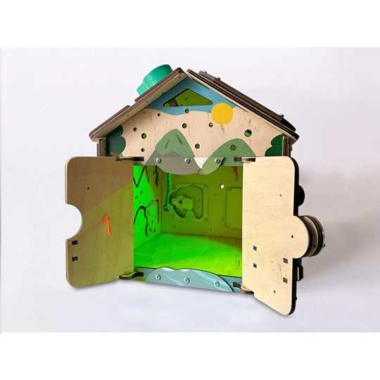 Po zdolání různých otevíracích mechanismů se dětem podaří otevřít dvířka do activity board domečku. V útulném domečku mohou ubytovat plyšová zvířátka nebo oblíbené panenky. Při otevírání a zavírání dvířek děti potrénují jemnou motoriku, koordinaci očí a rukou i logické myšlení.