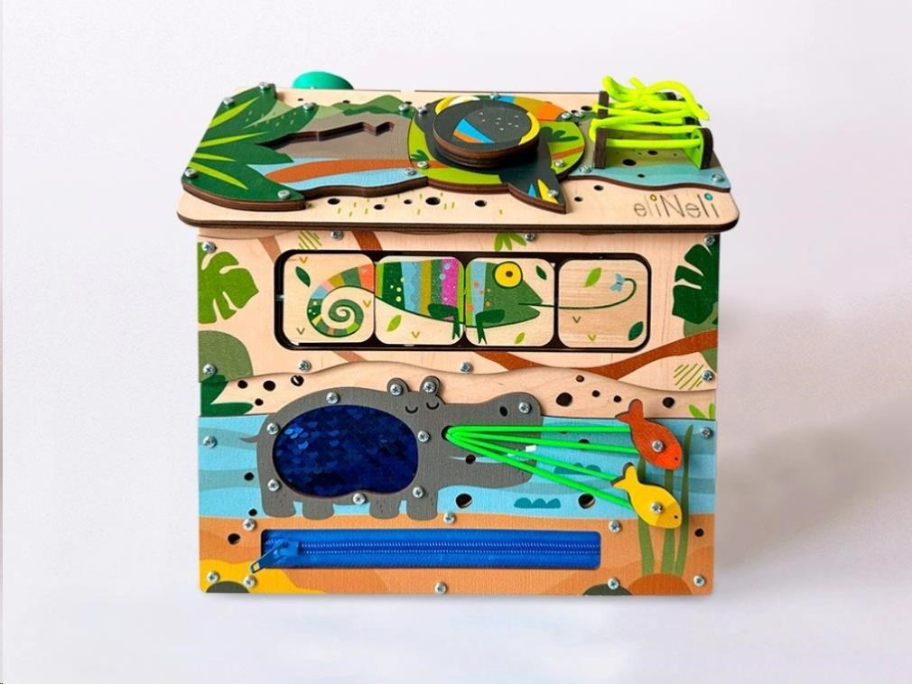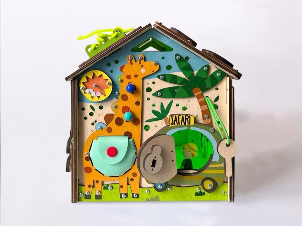 Domeček activity board - Safari je složen ze šesti desek s hracími a montessori prvky zaměřenými na zručnost, logiku, kreativitu a trpělivost. Domeček vtáhne děti do světa objevování a fantazie, kde si děti samy hrají a učí se tím nejpřirozenějším způsobem, pomocí hry.