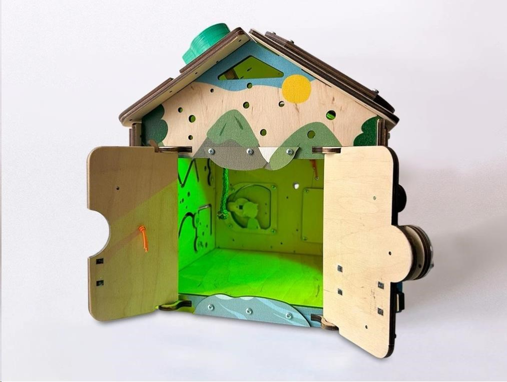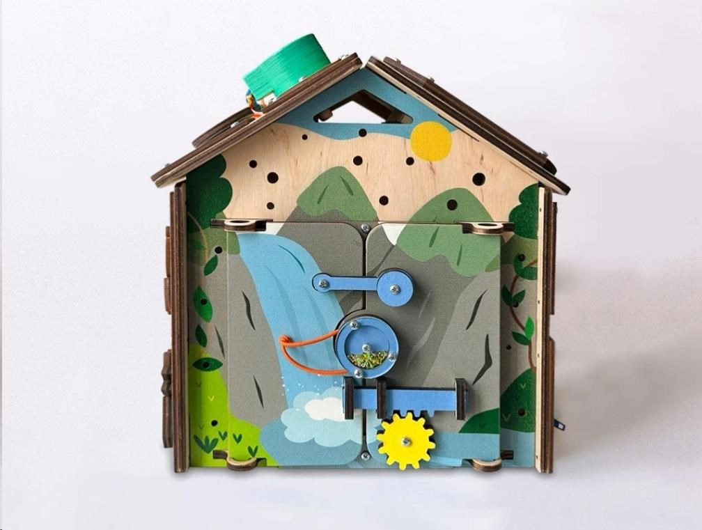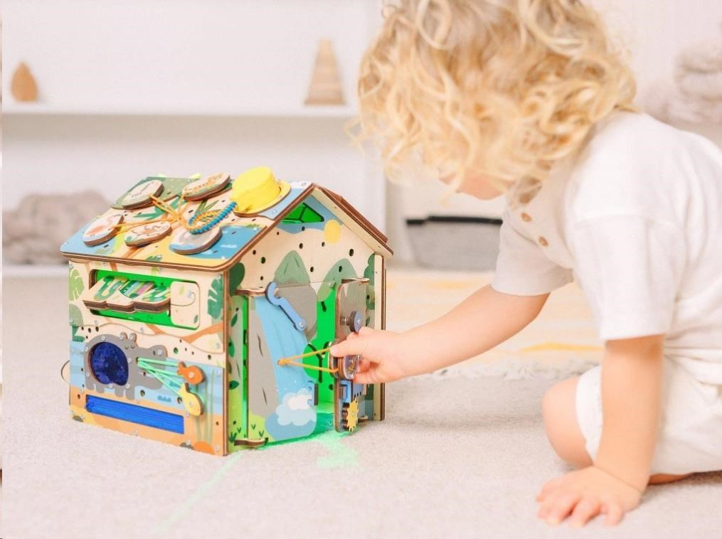 Po zdolání různých otevíracích mechanismů se dětem podaří otevřít dvířka do activity board domečku. V útulném domečku mohou ubytovat plyšová zvířátka nebo oblíbené panenky. Při otevírání a zavírání dvířek děti potrénují jemnou motoriku, koordinaci očí a rukou i logické myšlení.
