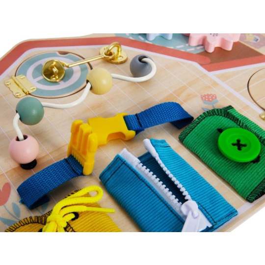 Activity board v podobě farmy zavede holčičky i chlapce na venkov, kde si pohrají s hracími prvky a osvojí si pár praktických dovedností. Activity board s ozubenými koly, korálkovým bludištěm, dvířky a okýnkem, různými zámky a různými způsoby zapínání vede děti k samostatnosti ve hře, v poznávání a učení se, v oblékání..