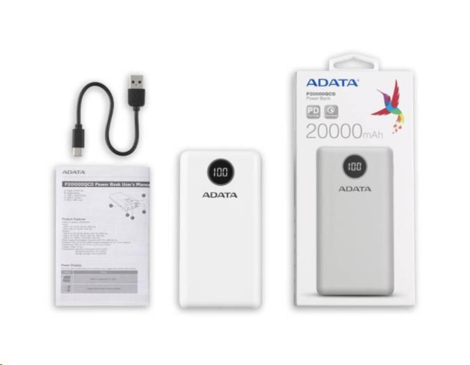 ADATA PowerBank P20000QCD - externí baterie pro mobil/tablet 20000mAh, 2,1A, bílá (74Wh)