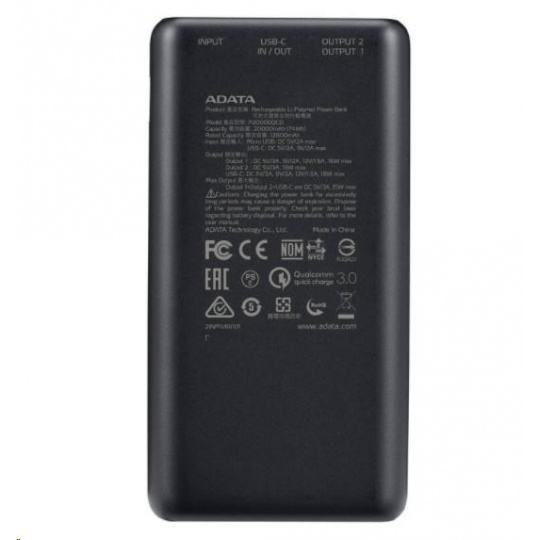 ADATA PowerBank P20000QCD - externí baterie pro mobil/tablet 20000mAh, 2,1A, černá (74Wh)