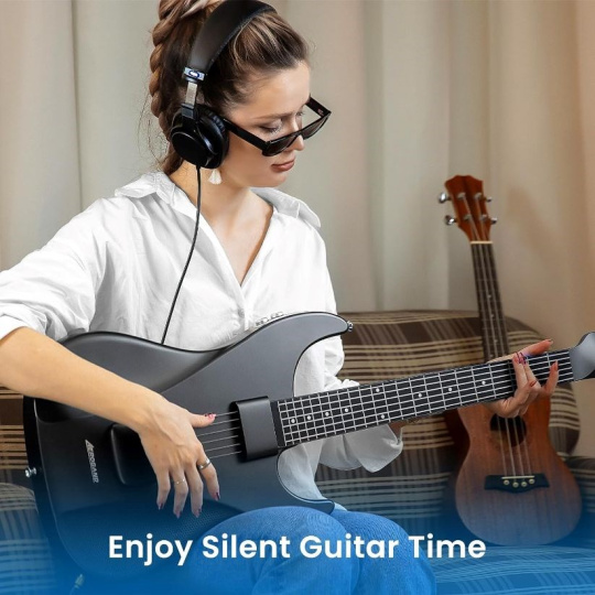 S 3,5mm audio výstupem pro sluchátka je AeroBand kytara kompatibilní jak s náhlavními, tak se špuntovými sluchátky a díky funkci Bluetooth i s bezdrátovými sluchátky. Díky tichému provedení můžete cvičit a hrát, aniž byste rušili ostatní – ať už jste doma, na cestách nebo venku. Seznamte své přátele s novým přístupem ke hře na kytaru díky AeroBand Guitar. Je to ideální způsob, jak probudit zájem, zejména u těch, kteří se s tradiční kytarou ještě nesetkali.