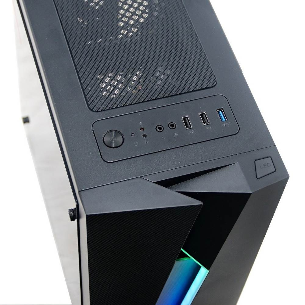 Počítačová skříň skleněným bočním krytem a RGB podsvětlením panelu.
