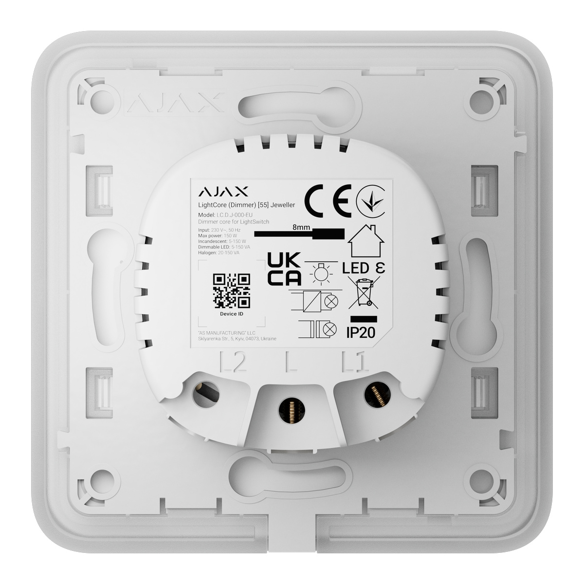 Ajax LightSwitch Dimmer Jeweller je chytrý dotykový nástěnný stmívač pro osvětlení určený pro vnitřní instalaci.