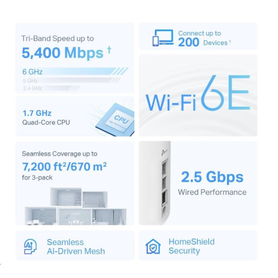 • Wi-Fi 6E pokrytí celé domácnosti – pokryjte plochu až 500 m2 ničím nerušeným Wi-Fi signálem příští generace a zapomeňte na mrtvé zóny pokrytí a načítání do vyrovnávací paměti