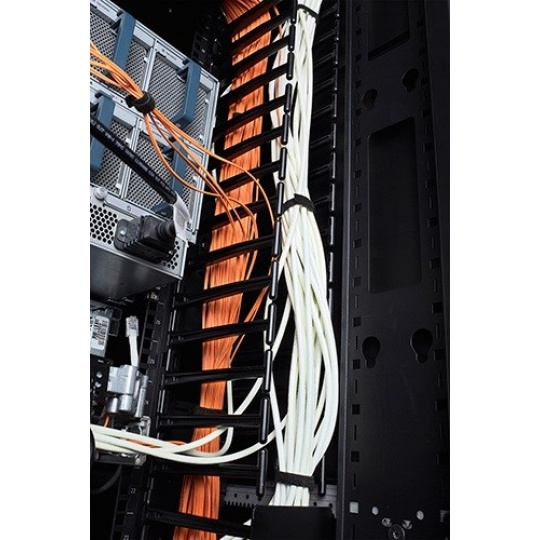 Další obrázky Svislé kanály mají u každé pozice 1U hladké plastové výstupky, které umožňují uspořádaný vstup a výstup propojovacích kabelů..