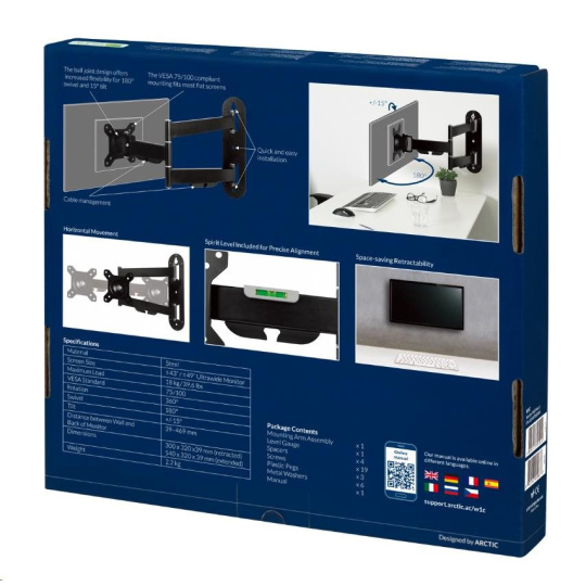 The ARCTIC W1C monitor wall mount supports the latest ultrawide monitors (up to 49 inches) with ease. Classic 16:9 monitors are also compatible (up to 43 inches). The W1C supports a total load 18 kg/39.6 lbs.
