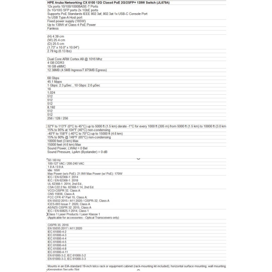 | Aruba 6100 12G Class4 PoE 2G/2SFP+ 139W Switch (JL679A) | |
