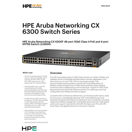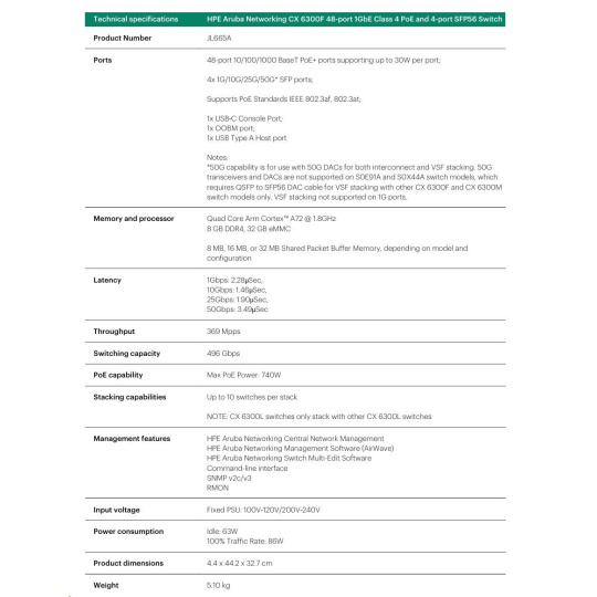 | Aruba 6300F 48-port 1GbE Class 4 PoE and 4-port SFP56 Switch (JL665A) | ||