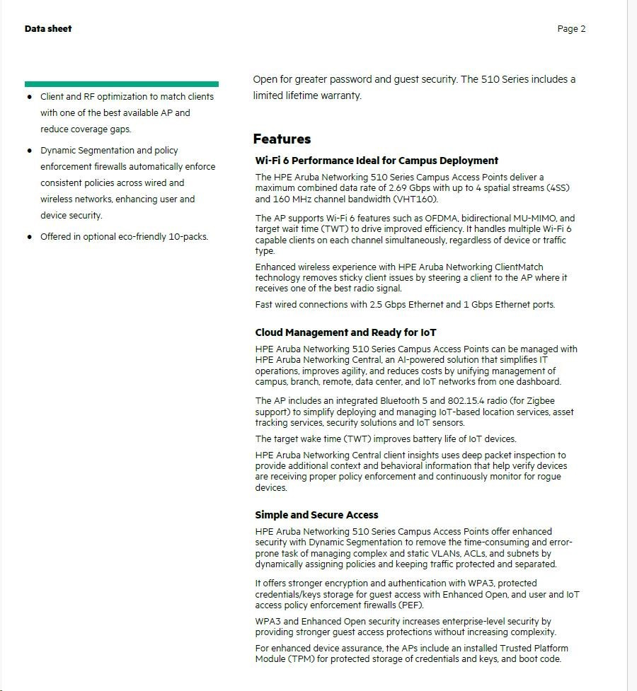 HPE Aruba Networking AP-515 (RW) Dual Radio 4x4/2x2 802.11ax Internal Antennas Unified Campus AP RENEW Q9H62A