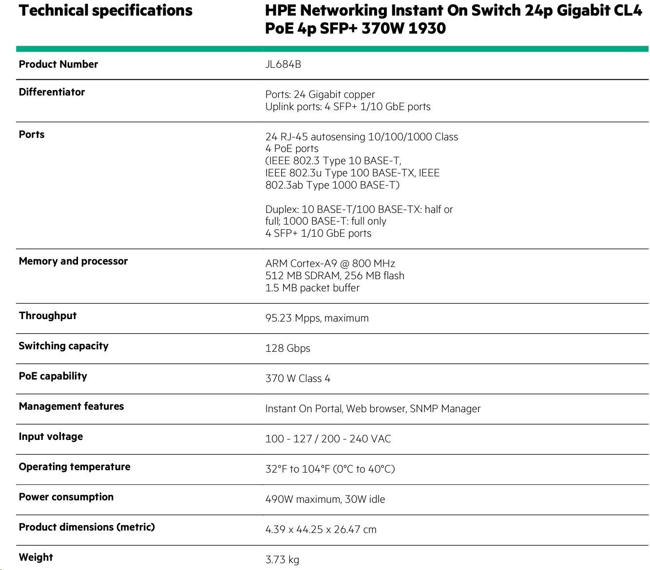 | Aruba Instant On 1930 24G Class4 PoE 4SFP/SFP+ 370W Switch (JL684B) | ||