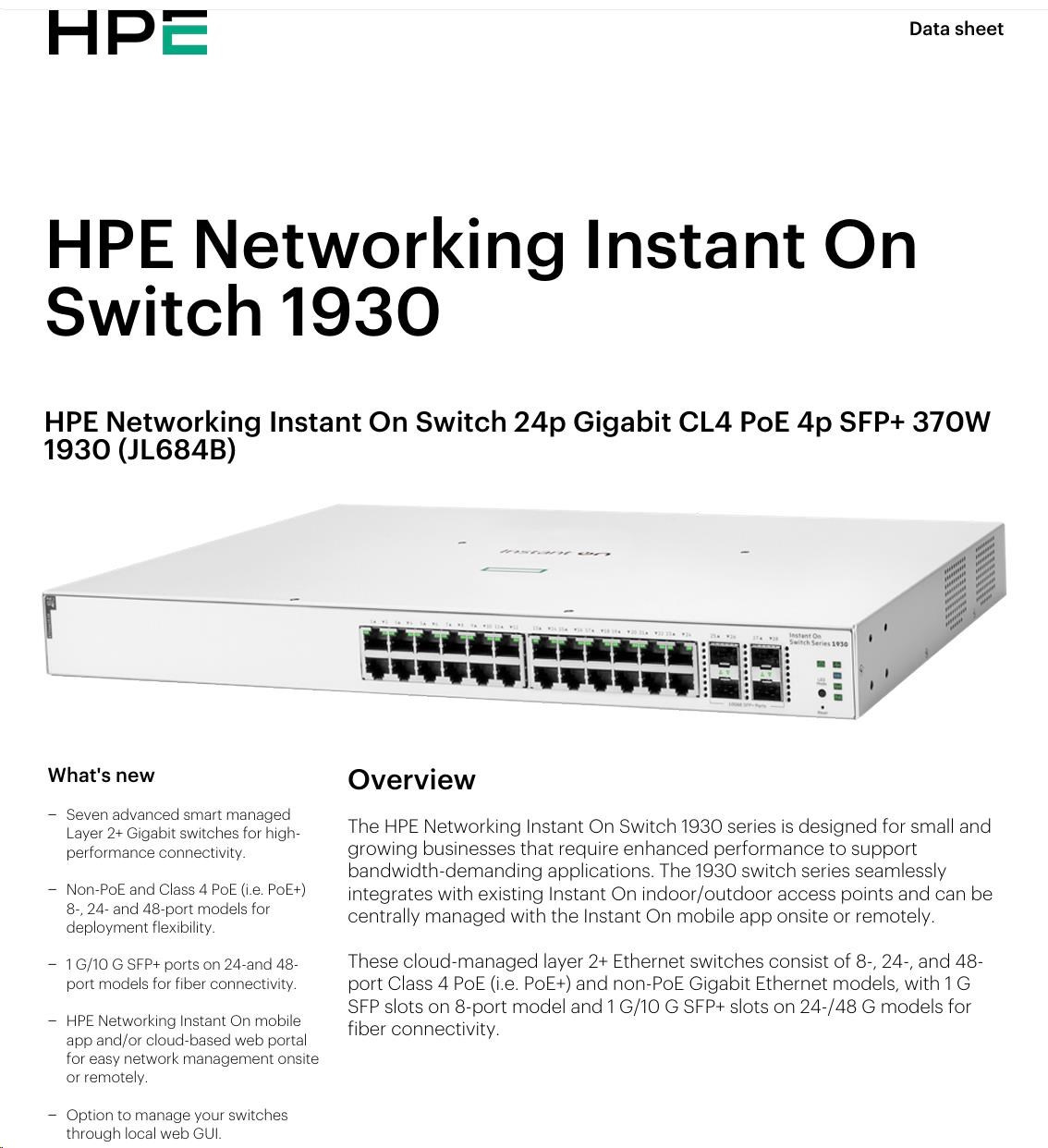 The Aruba Instant On 1930 switches features advanced, smart-managed, fixed- configuration Gigabit switches designed for small businesses that are easy-to-deploy and affordable. They're made to handle today's bandwidth-heavy applications like voice and video conferencing, enabling consistent connectivity to enhance performance.