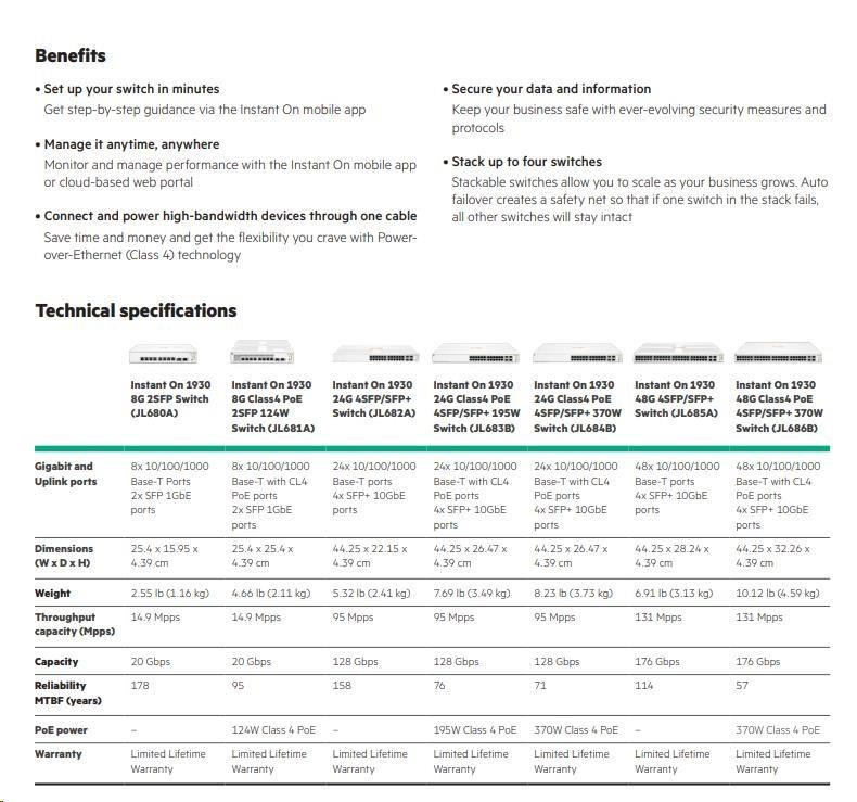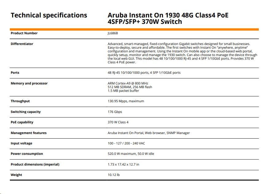 | Aruba Instant On 1930 48G Class4 PoE 4SFP/SFP+ 370W Switch (JL686B) | ||
