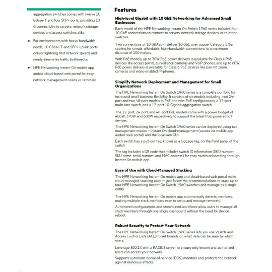 HPE Networking Instant On Switch 40p Gigabit CL4 8p Gigabit CL6 PoE 2p 10GBT 2p SFP+ 600W 1960 (JL809A)