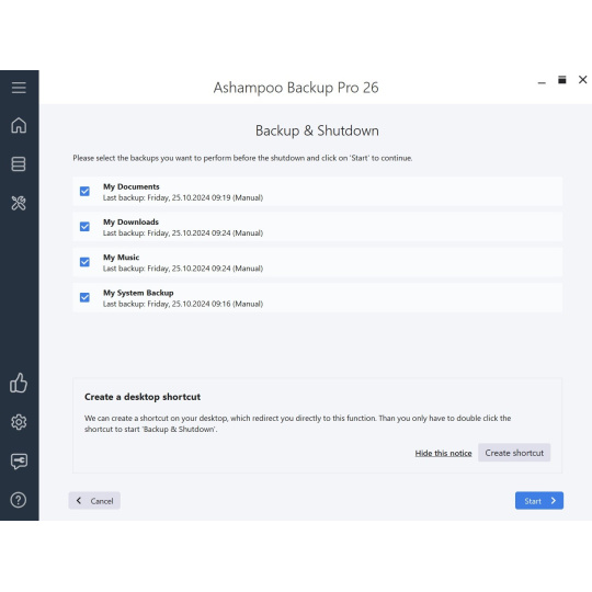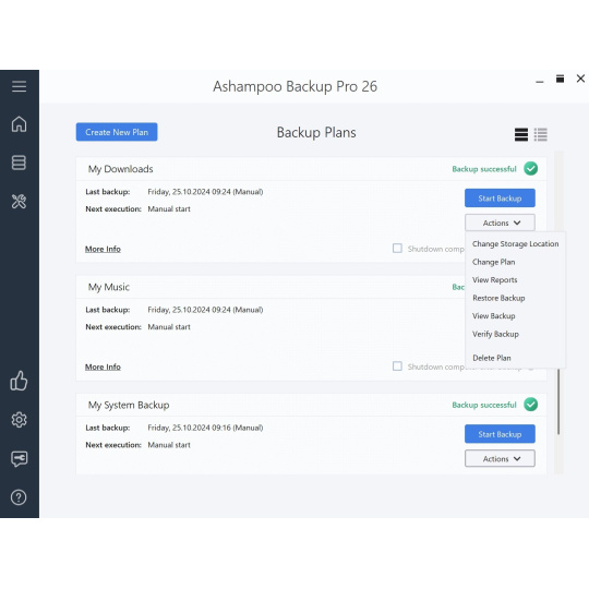 Strategie zabezpečení začleněné do tohoto zálohovacího řešení byly navrženy s ohledem na firemní použití a splňují přísné standardy vyžadované v profesionálním prostředí. Protože jen ty nejvyšší standardy jsou dostatečně dobré pro ochranu vašich souborů! Profesionální správci oceňují solidní zálohovací engine, neustálé ověřování souborů a silné šifrování, a proto Ashampoo® Backup Pro používají i významné společnosti. Získejte pro svůj počítač ochranu souborů na průmyslové úrovni!