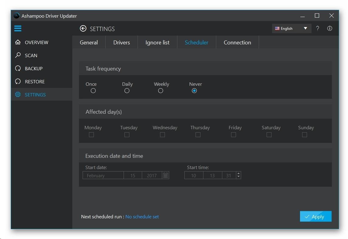 Vy rozhodujete, kdy Ashampoo Driver Updater vstoupí do akce. Vestavěný plánovač vám dává spolehlivou kontrolu nad tím, kdy bude program vyhledávat aktualizace ve vašem systému. Jakmile jej jednou nastavíte, nemusíte na něj už ani pomyslet a váš systém bude vždy aktuální!