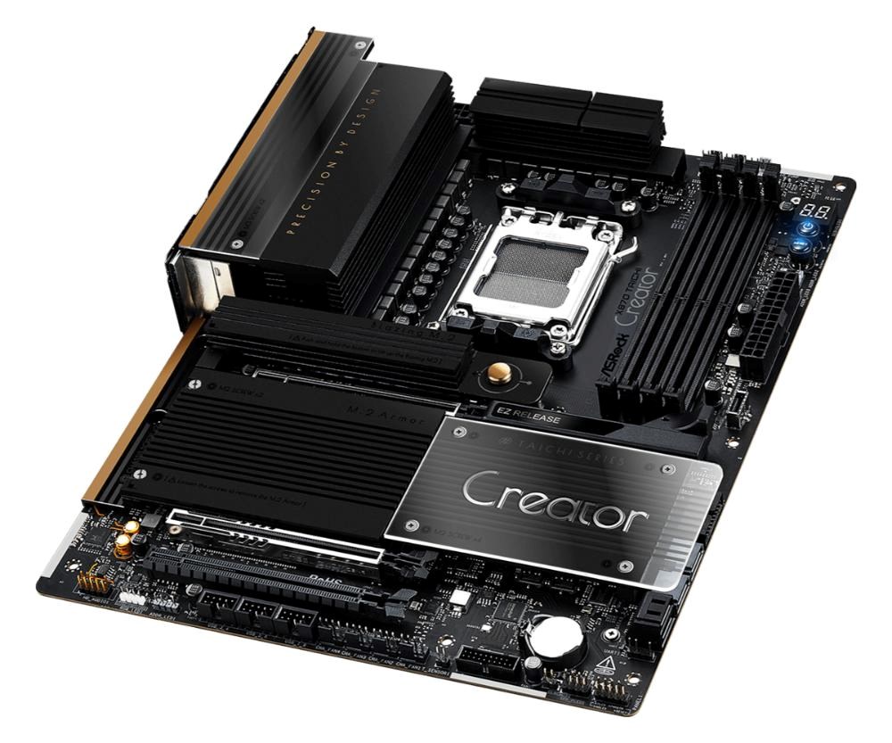 The X870 Taichi Creator features 10GbE and 5GbE LAN, dual USB4 Type-C, dual Gen5 M.2 slots, and dual PCIe 5.0 x16 slots with extra spacing for dual-GPU setups.