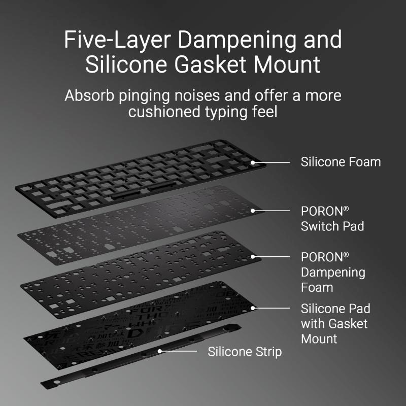 - Vylepšené možnosti psaní: Integrované pětivrstvé tlumení a silikonové těsnění pohlcují zvuky cinkání a nabízejí tlumenější pocit při psaní