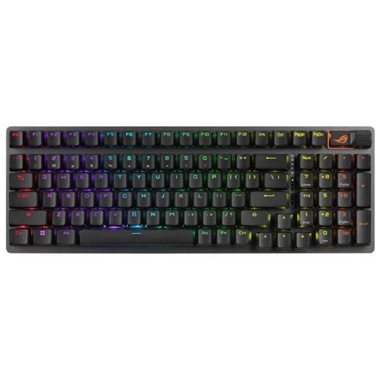 Bezdrátová herní klávesnice ROG Strix Scope II 96 s připojením ve třech režimech, klávesové zkratky pro streamování, multifunkční ovládací prvky, mechanické spínače ROG NX s možností výměny za provozu, stabilizátory klávesnice ROG, krytky kláves PBT doubleshot a silikonová tlumicí pěna, tři úhly sklonu a opěrka zápěstí