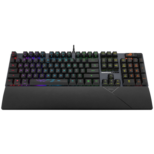 Herní klávesnice ROG Strix Scope II s předem namazanými mechanickými spínači ROG NX Red, pěnou tlumící zvuk, dvojitými krytkami kláves PBT nebo ABS s UV povlakem, klávesovými zkratkami pro streamování, multifunkčními ovládacími prvky, třemi úhly sklonu a opěrkou zápěstí