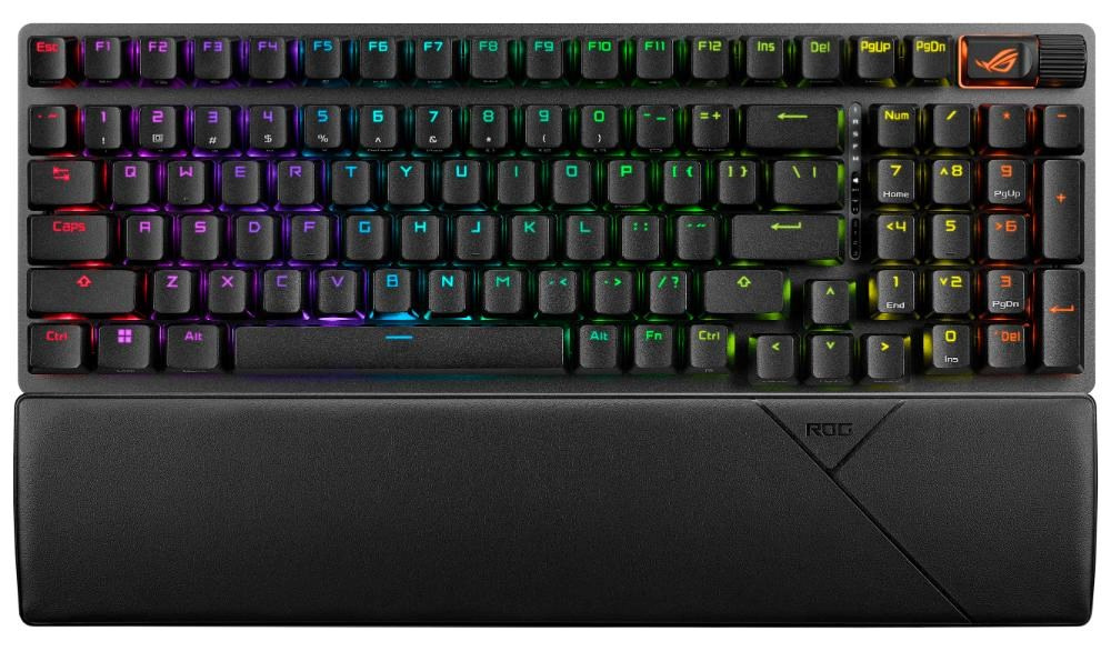 Herní klávesnice ROG Strix Scope II X s mechanickými spínači ROG NX V2 s možností výměny za provozu, pěnovým tlumením zvuku, zdvojenými klávesami PBT nebo ABS s UV povlakem, streamovacími klávesami, multifunkčními ovládacími prvky, třemi úhly sklonu a opěrkou zápěstí.