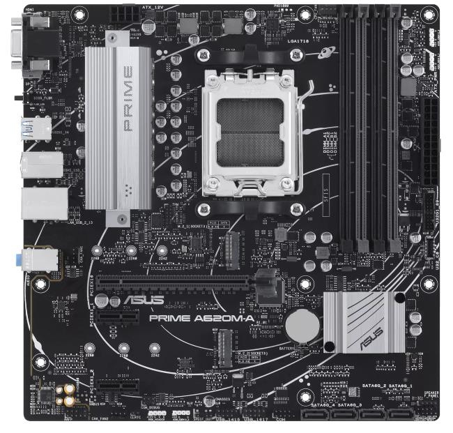 ASUS PRIME A620M-A is equipped with outstanding features, including 6-layer PCB design, DDR5 6400+(OC), PCIe 4.0 support, dual M.2 slots, USB 3.2 Gen 1 ports, front USB 3.2 Gen 1 Type-C®, BIOS FlashBack™, DisplayPort /HDMI™/VGA, Addressable Gen 2 headers, Aura RGB header, Aura Sync, Q-LED Core, ASUS OptiMem II, Fan Xpert 2+, Power Saving, Two-Way AI Noise Cancellation, Armoury Crate, ASUS 5X PROTECTION III and SafeSlot Core, which will bring users maximizing performance, stability and compatibility for the very best DIY PC experiences.
