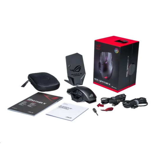 - Complete command in battle - Get into the fight with ROG Spatha X. This wireless gaming mouse features dual-mode connectivity, allowing you to play wirelessly via RF 2.4 GHz or traditionally with a wired USB-C® connection. A specially tuned 19,000 dpi sensor lets you take down opponents swiftly with extreme accuracy, while 12 programmable buttons ensure all commands are at your fingertips. In addition, ROG Spatha X features exclusive push-fit switch sockets, ROG Micro Switch, Aura Sync RGBs, and a magnetic charging dock.