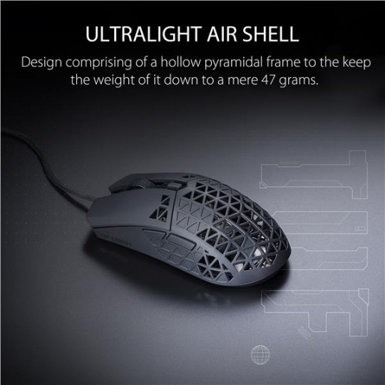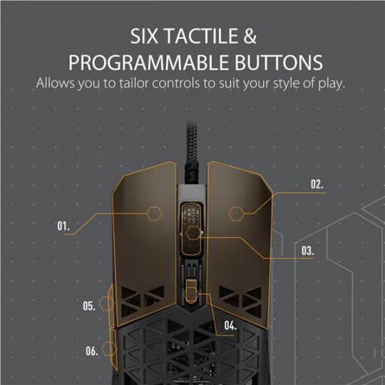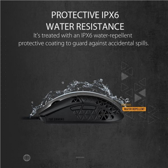 A lightweight wired gaming mouse with 16,000 dpi sensor, six programmable buttons, ultralight Air Shell, IPX6 water resistance , ASUS Antibacterial Guard, TUF Gaming Paracord and pure PTFE feet