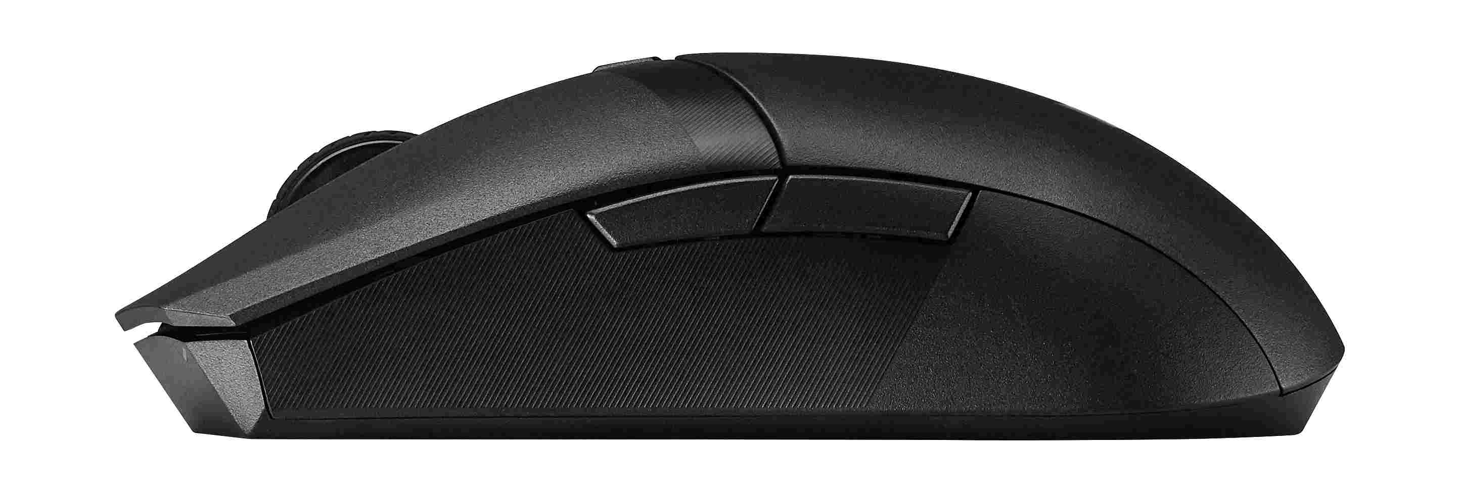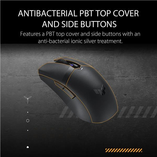 A lightweight ambidextrous gaming mouse with dual wireless modes, a 12,000 dpi sensor, six programmable buttons, PBT top cover with ASUS Antibacterial Guard, 100% PTFE mouse feet and Armoury Crate.