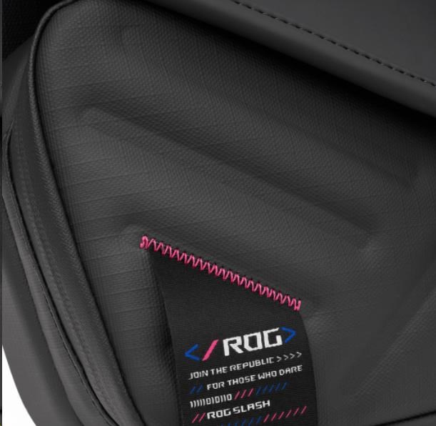 Brašny ROG SLASH jsou sice nenápadné, ale pro ty, kteří si jich všimnou, představují odvážné prohlášení. Modré a růžové akcenty a prošívání zdobí tašku, dodávají jí barevný nádech a zajišťují, aby svět věděl, že nosíte něco opravdu výjimečného. Vzhled ROG SLASH je také vybaven jedinečným monogramem ROG.