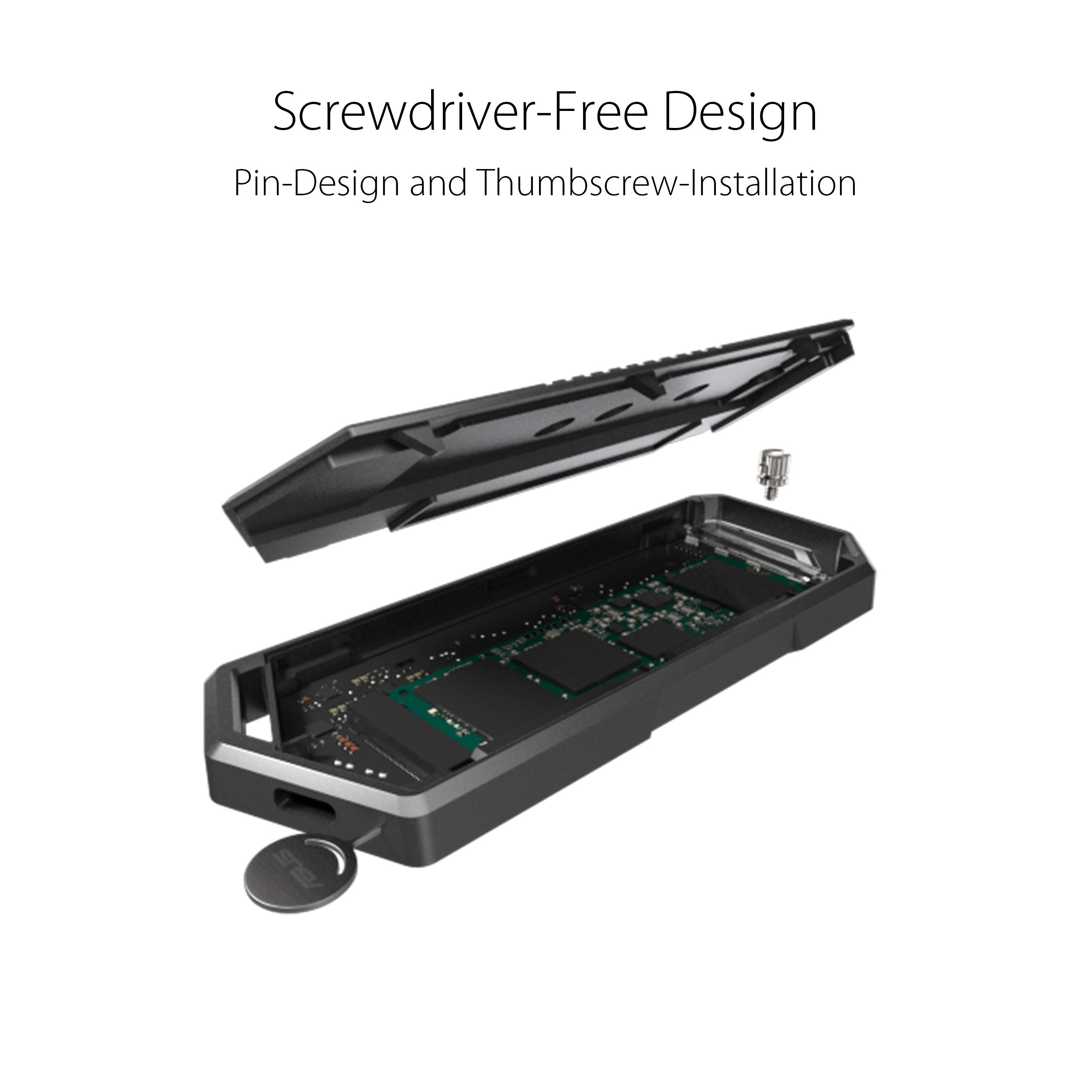 Box pro externí M.2 NVMe SSD disky ROG Strix Arion - USB 3.2 GEN2 Type-C (10 Gb/s), dva kabely USB-C do USB-C a USB-A, instalace bez použití šroubováku, obsahuje chladicí podložky, vhodný pro PCIe 2280/2260/2242/2230 M key/B+M Key