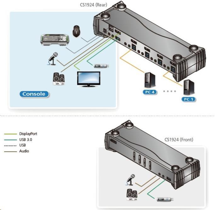 - Nezávislé přepínání USB periferií, audia a KVM