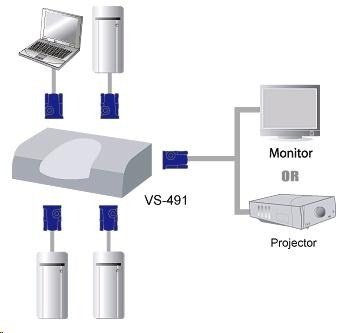 Video elektronický přepínač 4 PC - 1 VGA VS-491 - výběr zdroje signálu pomocí tlačítka - rozlišení až 1920x1440 - VGA, SVGA, Multisync - zesiluje VGA signál - power save mod při vypnutém PC - až 10m vzdálenost kabelů bez ztráty kvality signálu - aktivní prvek, včetně napájecího adaptéru - DDC, DDC2, DDC2B Compatible. Konektory: - vstup 15pin HDB 4x Female - výstup 15pin HDB 1x Female - váha 220g - rozměry 120x65x64mm.