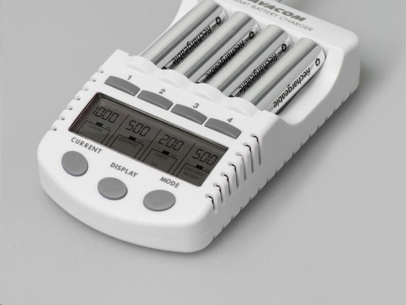 Inteligentní čtyřkanálová nabíječka tužkových AA a mikrotužkových AAA baterií. Nabíjí Ni-MH a Ni-Cd baterie. Nabíjecí proud 200, 500, 700, a 1000mA.