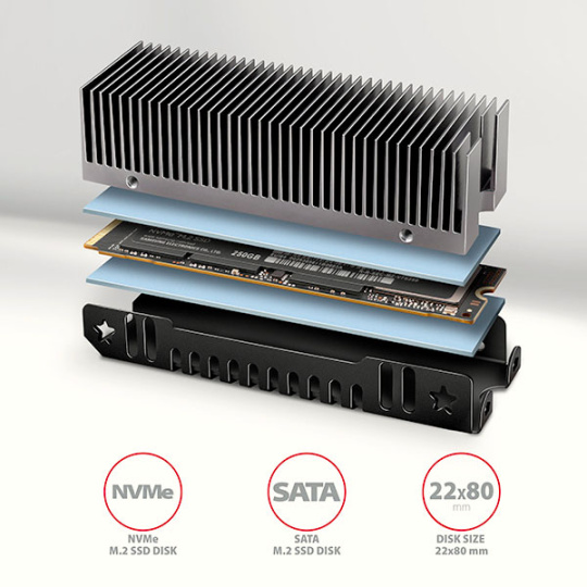 AXAGON CLR-M2XT ALU je pasivní hliníkový chladič určený pro intenzivní chlazení výkonných NVMe M.2 SSD disků. Univerzální heatsink lze použít pro M.2 karty o rozměru 22 x 80 mm. Dodávané teplovodivé podložky, umožní montáž chladiče pro všechny jednostranné i oboustranné M.2 SSD disky.