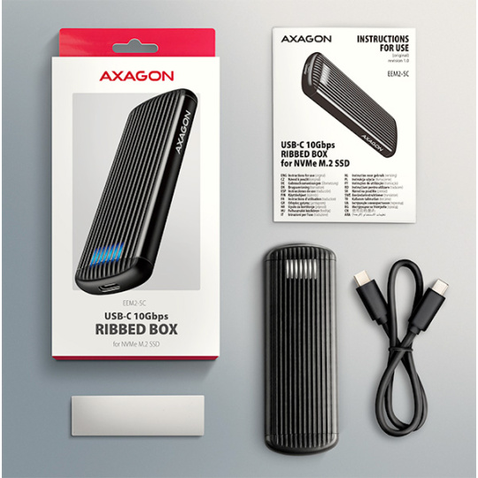 Hliníkový externí AXAGON EEM2-SC RIBBED box s USB 10Gbps rozhraním určený pro M.2 NVMe SSD disky. Stabilní a rychlé připojení zajišťuje oboustranný USB-C konektor. V balení naleznete kabel USB-C -> USB-C pro připojení boxu k počítači.