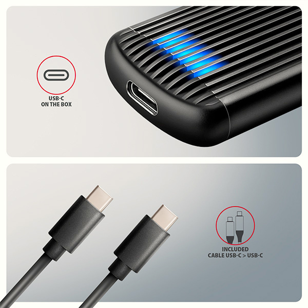 Hliníkový externí AXAGON EEM2-SC RIBBED box s USB 10Gbps rozhraním určený pro M.2 NVMe SSD disky. Stabilní a rychlé připojení zajišťuje oboustranný USB-C konektor. V balení naleznete kabel USB-C -> USB-C pro připojení boxu k počítači.