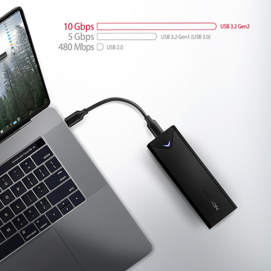Díky USB 3.2 Gen 2 rozhraní je přenosová rychlost až 10 Gb/s. Externí M.2 box podporuje i další moderní funkce např. UASP, TRIM a umožňuje čtení S.M.A.R.T. informací monitorujících stav disku. Podpora úsporného režimu při nečinnosti.