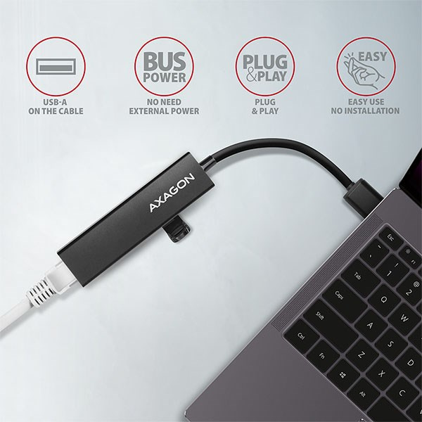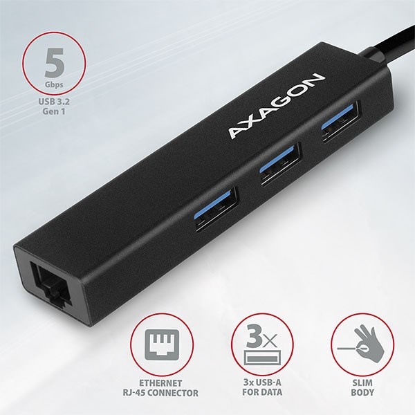 Štíhlý kovový USB 3.2 Gen 1 (USB 3.0) multi-port hub AXAGON HMA-GL3A nejen připojí k notebooku nebo počítači až tři USB zařízení současně, ale přidá také gigabitovou síťovou kartu, která připojí váš počítač k vysokorychlostní síti. Kovové tělo hubu je vyrobeno z hliníku a zajišťuje tak dokonalou mechanickou ochranu pro časté přenášení. Elegantní, jemně strukturovaný povrch brání nežádoucím otiskům. Napevno uchycený USB kabel délky 20 cm je ideální pro uživatele mobilních zařízení.
