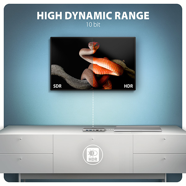 HDMI výstup poskytuje kvalitní obraz až do rozlišení 4K/60Hz Ultra HD a podporuje přenos vícekanálového zvuku. Podporovány jsou také vysoké frekvence v oblíbených hráčských rozlišeních 2K/120Hz nebo FullHD/240Hz. Díky podpoře HDR (vysoký dynamický rozsah) si můžete bez omezení vychutnat výrazně rozšířený rozsah barev a kontrastů. Pro správné fungování video výstupu je nutné, aby notebook měl USB-C port s podporou DisplayPort Alternate Mode (DP Alt Mode) nebo port Thunderbolt 3, 4 a výše.