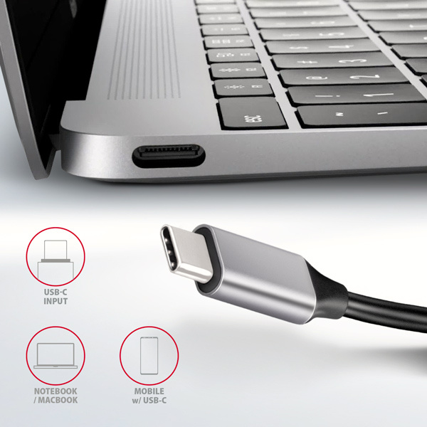 HDMI výstup poskytuje kvalitní obraz až do rozlišení 4K/30Hz Ultra HD a podporuje přenos vícekanálového zvuku. Podporována jsou také oblíbená hráčská rozlišení WQHD 2560 x 1440 při 60Hz nebo FullHD 1920 x 1080 při 60, 100 a 120Hz max. Pro správné fungování video výstupu je nutné, aby USB-C port notebooku podporoval DisplayPort Alternate Mode (DP Alt Mode) nebo Thunderbolt 3.