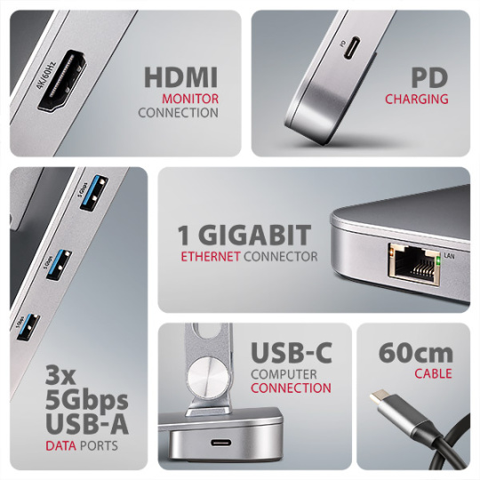 AXAGON HMC-STND 7in1 Hub & Stand je jedinečný multifunkční hub integrovaný do stojanu pro notebook nebo tablet. Tento hub rozšíří Váš notebook nebo tablet o dalších šest portů. Váš notebook připojíte k hubu přes USB-C USB-C kabel dlouhý 60 cm. Okamžitě tak máte k dispozici připojení pro monitor, tři USB zařízení, konektor RJ-45 pro Gigabitovou ethernet síť a napájení notebooku pomocí technologie Power Delivery. Stojan s dvěma klouby zlepšuje ergonomii a pohodlí při práci a je vhodný pro zařízení od 10" do 16". Je ideální jako dokovací stanice 7v1 pro Windows notebooky i Apple MacBook Air nebo MacBook Pro.