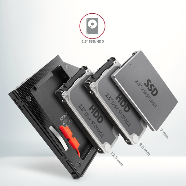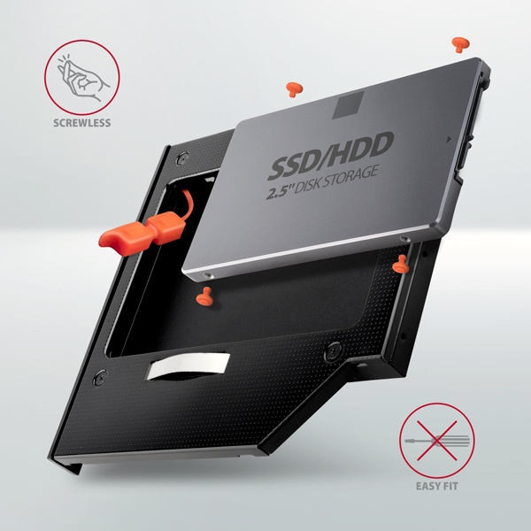 Do rámečku je možné použít standardní SSD disky výšky 7 mm i pevné disky výšky 9.5 a 12.5 mm o rozměru 2.5". ODD caddy s osazeným diskem se chová jako standardní pevný disk v operačním systému i v BIOSu (UEFI). Vložením disku do redukce snadno přidáte interní 2.5" disk, kterým lze doplnit stávající disk v notebooku. Díky podpoře bootování lze přidáním 2.5" SSD disku výrazně zrychlit starší notebook.