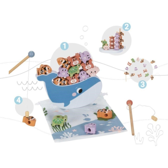 Soubor her Rybky 4v1 se skládá ze 4 oblíbených dětských her jako jsou balanční hra, dřevěná nasazovací hra, navlékání a rybolov, se společnou tématikou - oceánem, mořskými živočichy. Všechny tyto hry jsou vyrobené z přírodního dřeva a jsou zárukou velké zábavy, která přirozeným způsobem rozvíjí dětské dovednosti. Mořským motivem i barvami je sada her 4v1 vhodná pro holčičky i kluky..