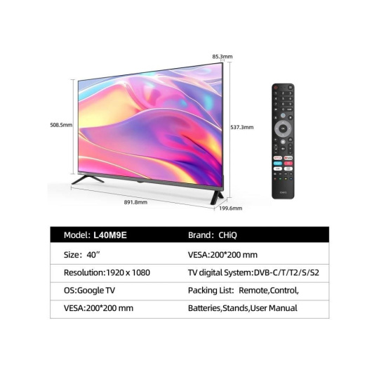 CHiQ 40“ L40M9E, metalická bezrámečková Smart Google TV s HDR10, HLG, obrazovkou s Full HD s rozlišením 1920 x 1080 pixelů, Dolby Audio a vylepšeným zvukem dbx-tv.