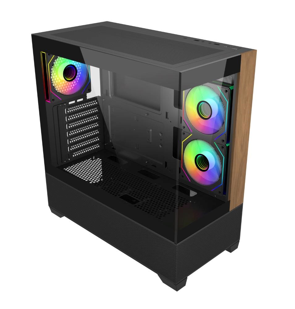 Model Elite 690 má čistý a moderní design a je vybaven dvěma panely z tvrzeného skla na přední a boční straně, které prezentují prémiové komponenty a osvětlení RGB. Přední panel kombinuje přírodní akcent s texturou dřeva se spodním sáním ze síťoviny, což přináší jak estetické teplo, tak efektivní proudění vzduchu. Díky rozsáhlému větrání na horní a spodní straně podporuje skříň univerzální konfigurace ventilátorů a chladičů, které umožňují výkonné vertikální chlazení. Ať už stavíte vysoce výkonnou předváděcí sestavu nebo stylovou stolní sestavu, Elite 690 poskytuje dokonalou rovnováhu mezi funkčností a formou.