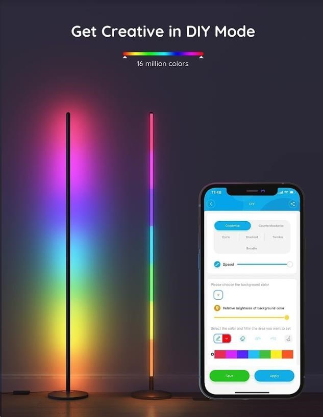 Zpříjemněte si svoji domácnost chytrou rohovou lampou Govee Smart Corner Floor Lamp, která zaujme na první pohled. Nabízí 16 milionů barev s 64 barevnými režimy a 6 režimy pro synchronizaci s hudbou. Světlo se ovládá hlasem přes Siri, Amazon Alexa nebo Google Assistant, přes aplikaci na chytrých telefonech a tabletech s operačními systémy iOS a Android nebo přes integrovaný ovladač. Lampa je vybavena úspornou LED žárovkou s technologií RGBICWW, která umožňuje zobrazení více barev najednou a má dlouhou životnost 50.000 hodin. Barevnou teplotu můžete upravovat v rozmezí od 3300K do 4300K při maximální svítivosti až 1000 lumenů.